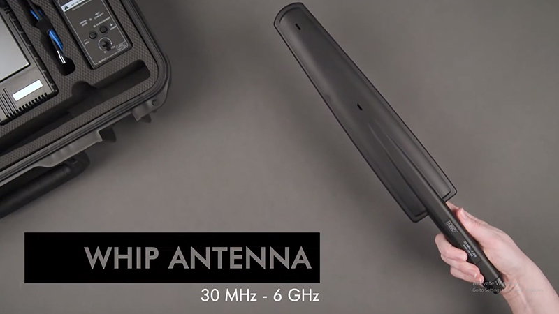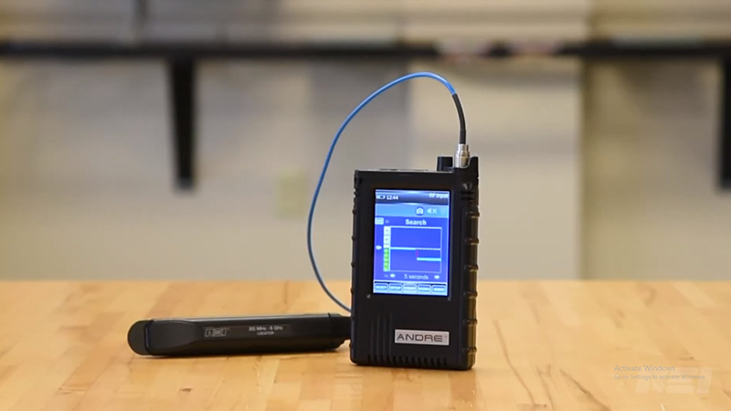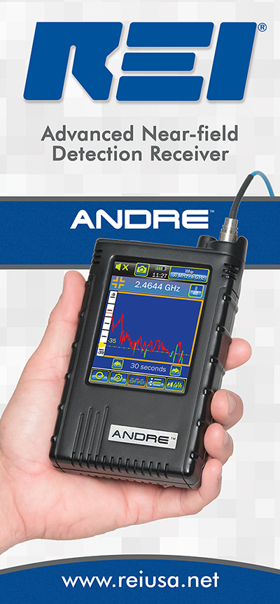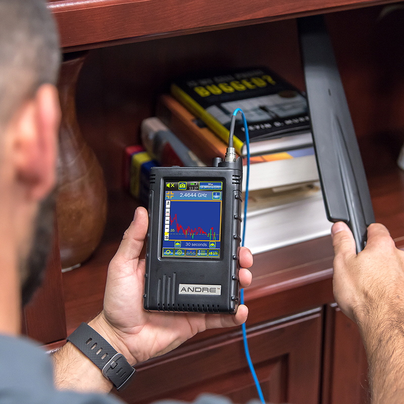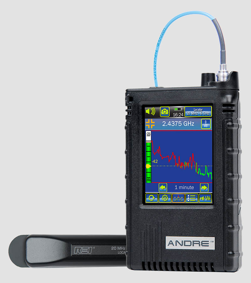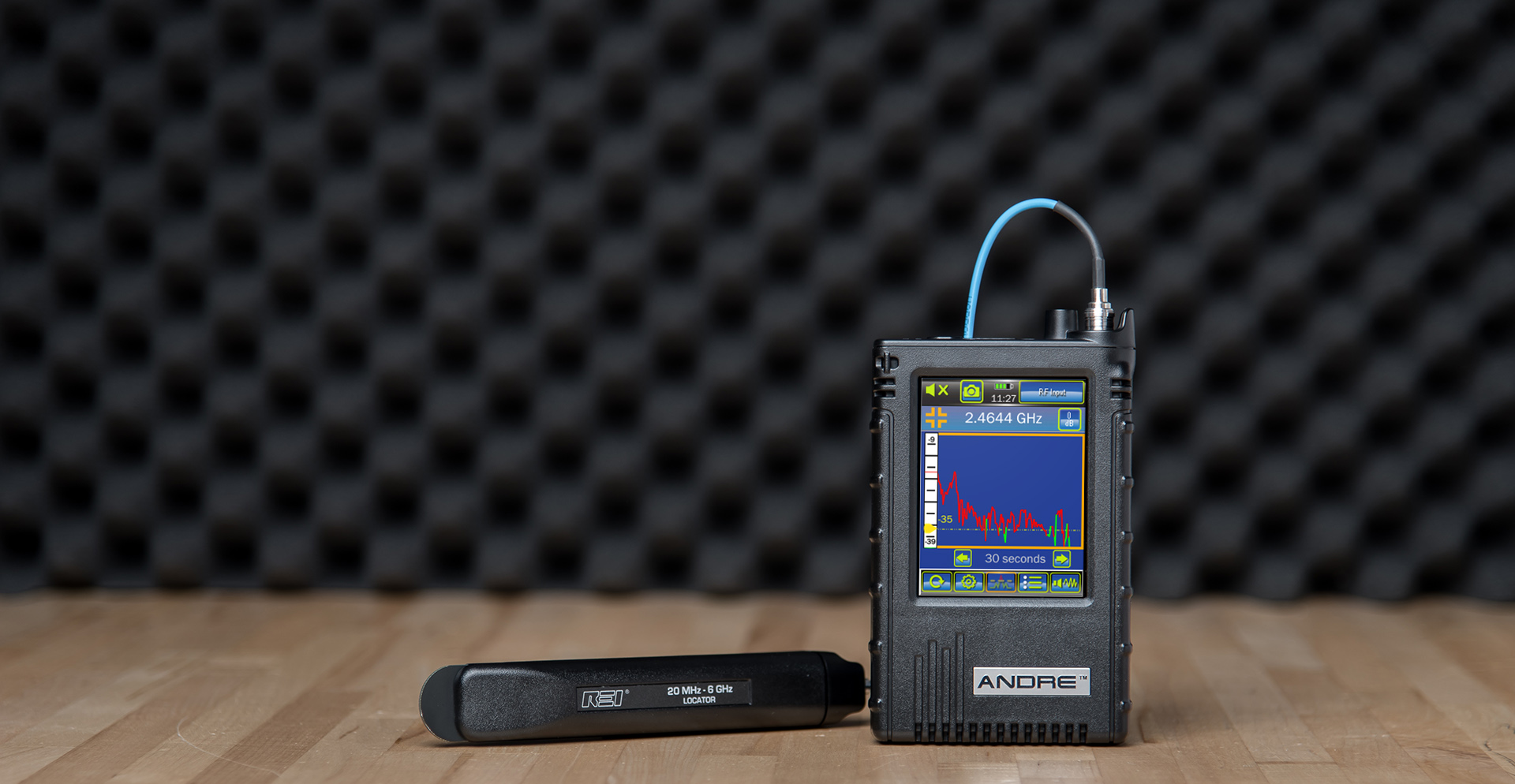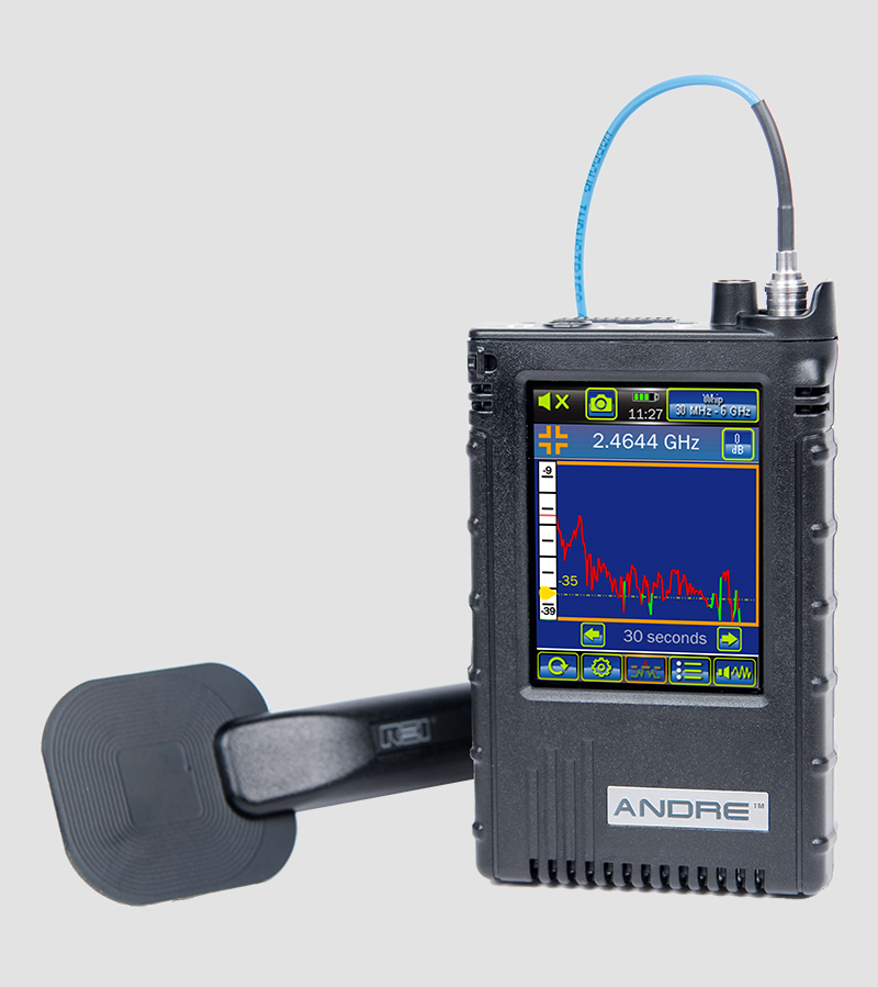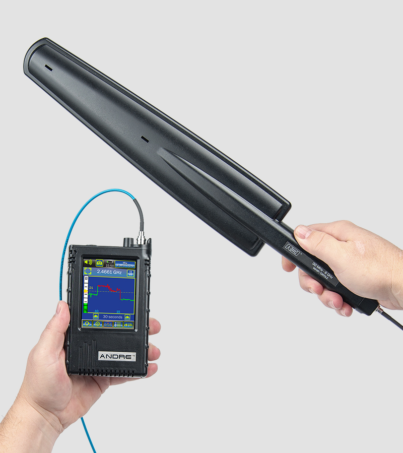Antenna probes included with the ANDRE can be used to sweep rooms and objects in search for known, unknown, illegal, disruptive, or interfering transmitters from 10 kHz to 6 GHz