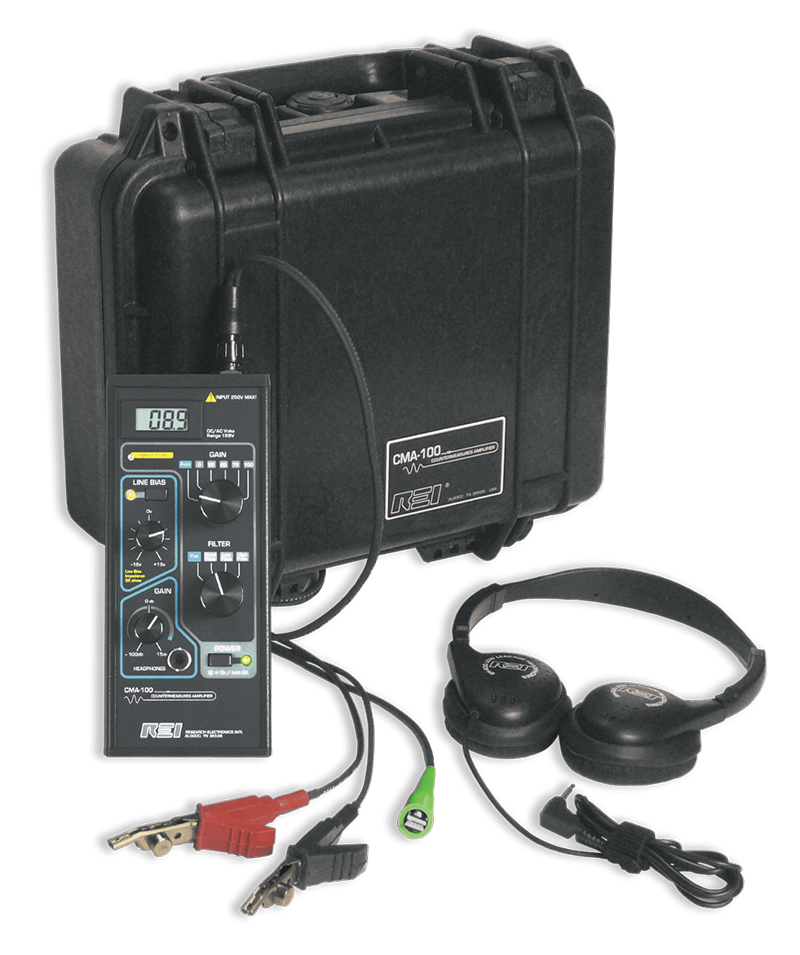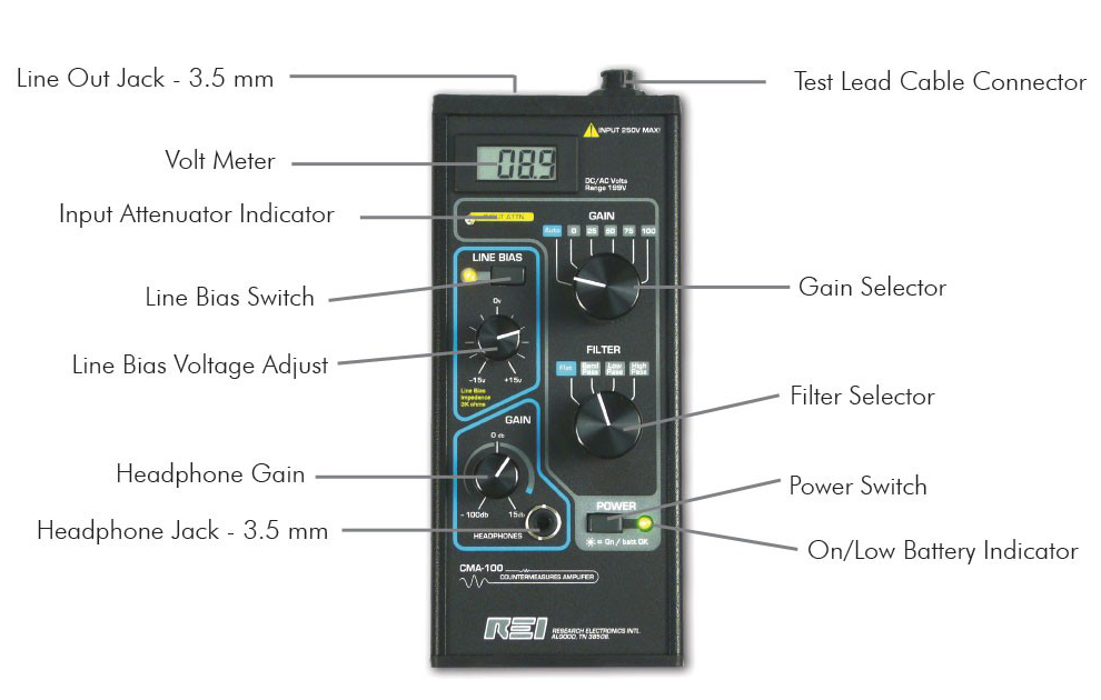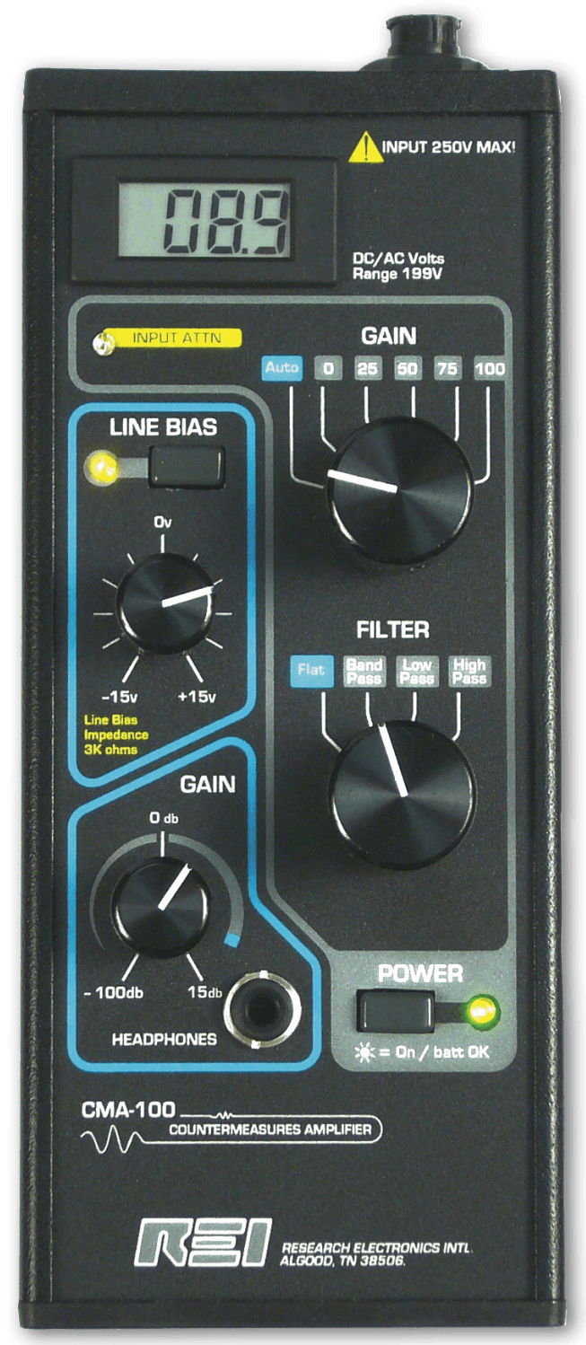 CMA-100 Countermeasures Amplifier is a high gain audio amplifier used to detect and identify certain types of surveillance devices attached to building wiring such as telephone wiring, LAN and server systems, AC power, and alarm wire. The CMA-100 Countermeasures Amplifier functions employ a sophisticated automatic gain control circuit that is superior to most audio amplifiers.