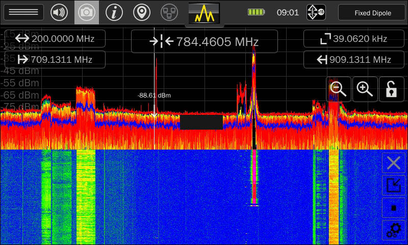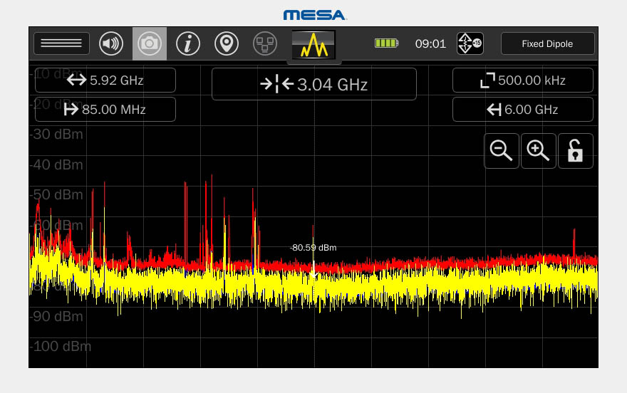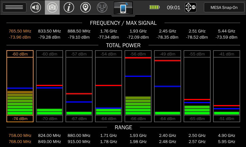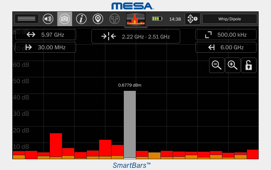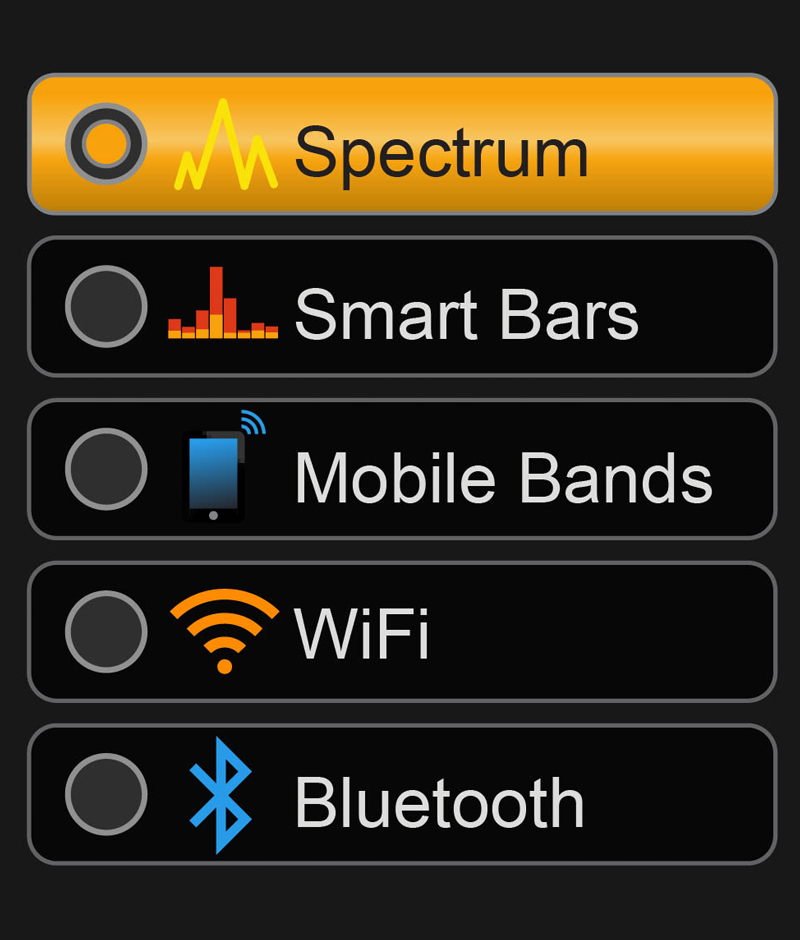 The MESA™ includes testing modes for RF spectrum analysis, Wifi, Bluetooth®, Mobile Bands and a new Patented SmartBars™ mode that displays like a broadband receiver and uniquely highlights changes in RF energy in a bar graph display. SmartBars™ is a quick way to see changes in energy across a wide frequency span.