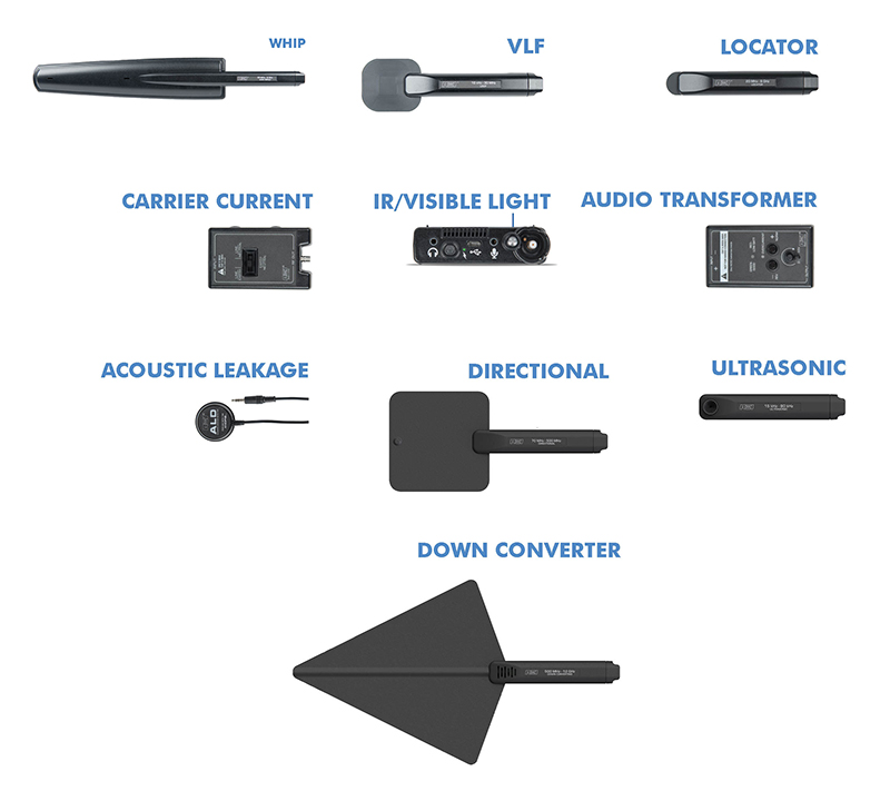 A wide selection of antennas and probes provides narrow to broad frequency ranges for varying applications. MESA™ auto-detects connected REI antennas/probes. Probes are also included for testing carrier current, ultrasonic, IR/Visible Light, and acoustic leakage for evaluating structure bound audio leakage.